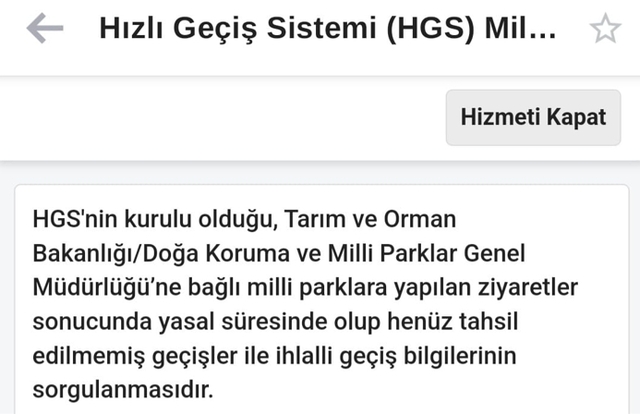 HIZLI GEÇİŞ SİSTEMİ (HGS) MİLLİ PARK İHLALLİ GEÇİŞ BİLGİLERİ SORGULAMA