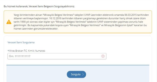 "Yargı birimlerinden alınan “Mirasçılık Belgesi Verilmesi” talepleri UYAP üzerinden elektronik ortamda 06.03.2015 tarihinden itibaren verilmeye başlanmıştır. 16.12.2016 tarihinden itibaren yargılamayı gerektiren durumlar hariç olmak üzere ölüm tarihi 1990 yılı sonrası olan kişiler için “Mirasçılık Belgesi Verilmesi” talebinin UYAP sisteminden yapılması zorunlu hale getirilmiştir. Bu kapsamda yukarıdaki koşula uyan “Mirasçılık Belgesi Verilmesi” ve Mirasçılık Belgesinin İptali” kararları bu hizmet üzerinden görüntülenebilecektir."