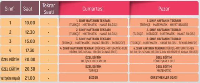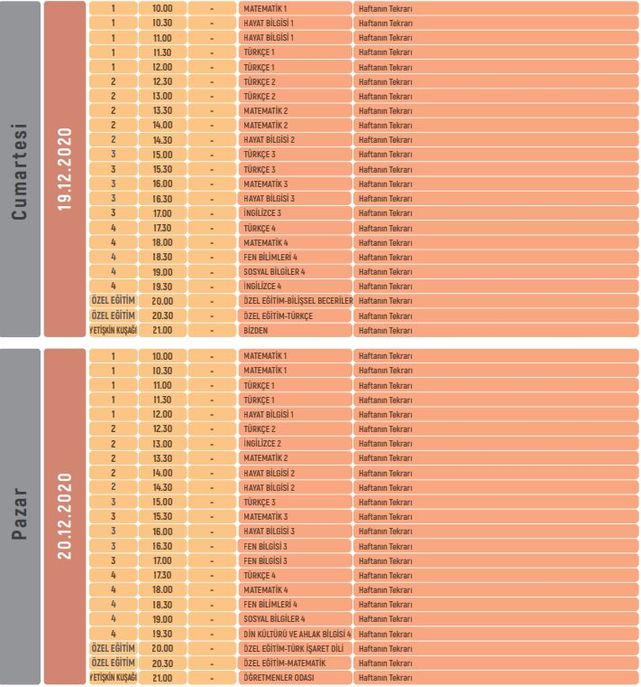 EBA TV İLKOKUL 19-20 ARALIK DERS PROGRAMI
