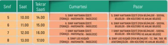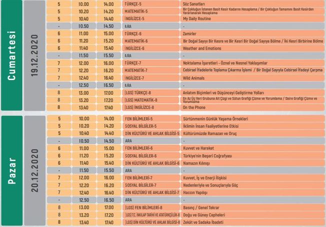 EBA TV ORTAOKUL 19-20 ARALIK DERS PROGRAMI
