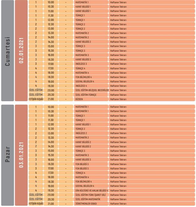 TRT EBA TV İLKOKUL 2-3 OCAK YAYIN AKIŞI