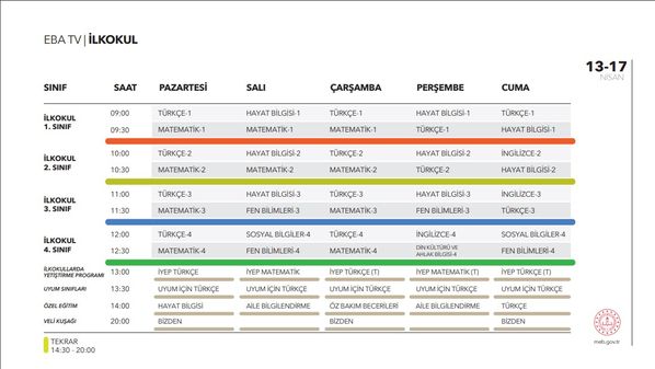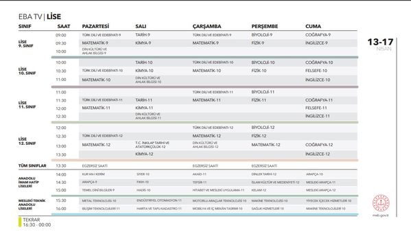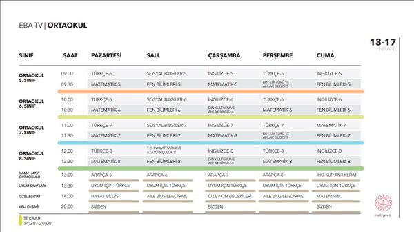 EBA TV UZAKTAN EĞİTİM DERS PROGRAMI (İLKOKUL, ORTAOKUL, LİSE)
