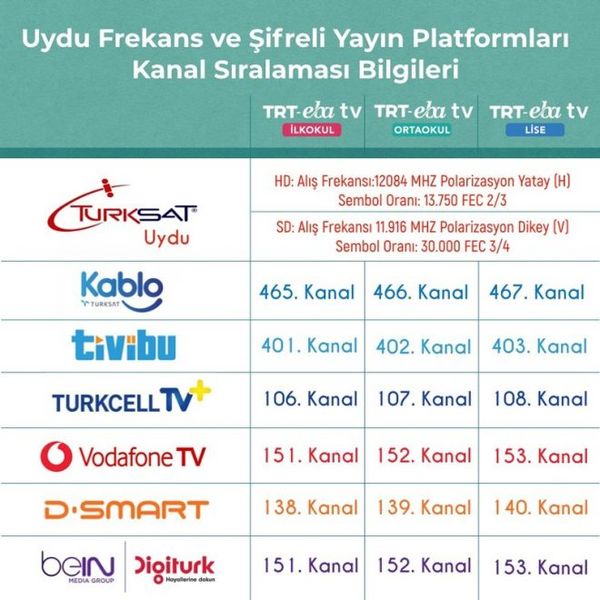 Frekans bilgilerimiz ve şifreli yayın platformu kanal sıralaması görselde