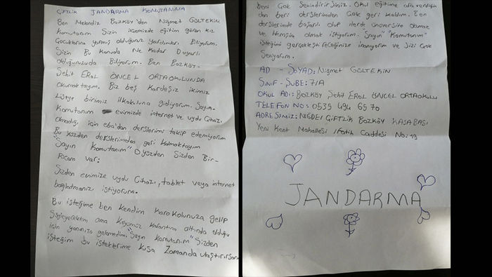İlçeye bağlı Bozköy beldesinde yaşayan Niğmet Gültekin (13), Çiftlik Jandarma Komutanlığına mektup yazarak evlerinde internet ve uydu bağlantısı olmadığı için EBA TV'den dersleri takip edemediğini belirterek bu araç gereçleri temin etmelerini rica etti.