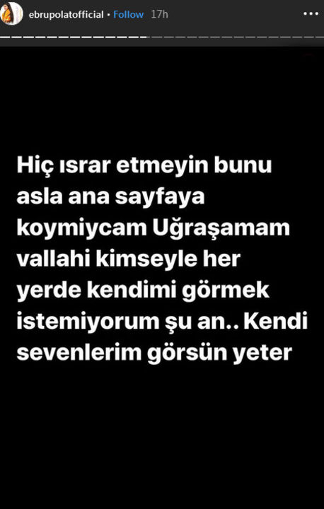 Instagram'ın hikaye bölümünden o anları yayınlayan Polat, takipçilerinden gelen isteklerin ardından, "Hiç ısrar etmeyin bunu asla ana sayfaya koymayacağım. Uğraşamam vallahi kimseyle. Her yerde kendimi görmek istemiyorum şu an. Kendi sevenlerim görsün yeter" açıklamasını yaptı.