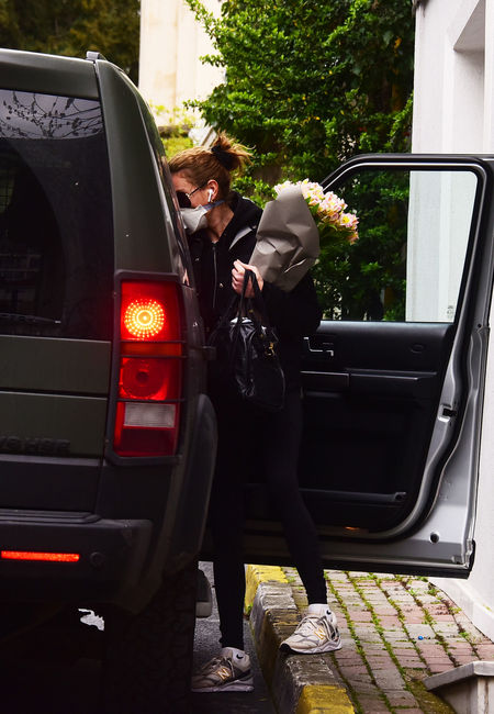 Kendisini eve bırakan sevgilisi Güven'in aldığı bir demet çiçekle araçtan inen oyuncu, gazetecilere "İyi Günler" diyerek evine girdi.