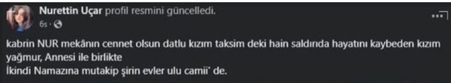 Nurettin Uçar sosyal medya hesabında profil fotoğrafını kızı yaptı ve şu açıklamalarda bulundu: "Kabrin nur, mekanın cennet olsun dadlu kızım. Taksim'deki hain saldırıda hayatını kaybeden kızın Yağmur, annesi ile birlikte ikindi namazına mutakip Şirin Evler Ulu Camii'de."