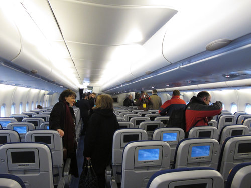 Ekonomi sınıfı uçağın birinci katında bulunuyor. Toplam koltuk kapasitesi 420. Yolcular 23 santimetrelik ekranlardan 16 film, 35 kanal dizi veya belgesel seyredebiliyor.
