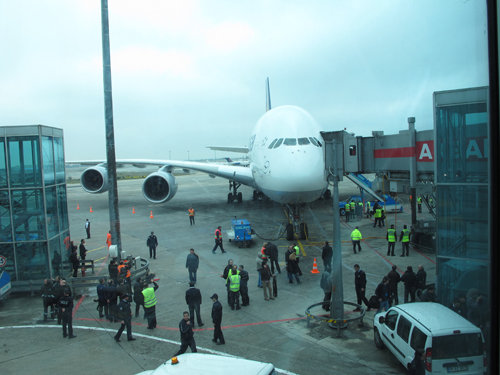 Dünya’nın en büyük yolcu uçağı Airbus A380, ilk defa bir havayolunun filosunda İstanbul’a geldi. Daha önce üretici firma Airbus tarafından iki defa Türkiye’ye getirilen A 380’in Türk Hava Yolları filosunda yer alması için de pazarlama ve tanıtım çalışmaları yapılıyor. Ancak Lufthansa renkleriyle İstanbul’a gelen A380 amacı ve hedefi tanıtım ve Türkiye hattında THY ile rekabette bir adım öne geçmek.