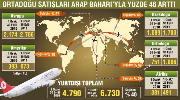 THY’nin Halep ve Şam seferlerini durdurmasıyla Suriyeli’nin İstanbul’a gelmesi zorlaşacak. Örneğin Şam’dan İstanbul’a 1 saat olan uçuş mesafesi, uçuşlar kapanınca Royal Jordanian ile Amman aktarmalı 5 saatte, Egypt Air ile Kahire aktarmalı 7 saatte, Ethiad ile Abu Dabi aktarmalı 15 saatte alınacak. İyi ilişkiler ile Arap Baharı hareketlerinin de etkisiyle Türkiye’ye Avrupa’nın yanı sıra Ortadoğu’dan da gelen turist sayısındaki artış, THY’nin rakamlarını da yükseltmişti. THY, Ortadoğu’da 2011 yılının ilk 9 ayı için açıkladığı verilere göre bir önceki yıla göre cirosunu yüzde 46 artırarak, 751 milyon liradan 1 milyar liraya çıkarmıştı.