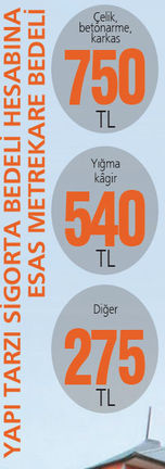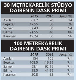 Zorunlu Deprem Sigortası asgari prim tutarı 25 liradan birinci derecede deprem bölgesinde 70, ikinci derecedeki deprem bölgesinde 60 liraya çıkarıldı. Böylece örneğin İstanbul'un kuzeyinde Sarıyer'deki 30 metrekarelik stüdyo dairelerin deprem sigortası primi yaklaşık yüzde 54 artacak