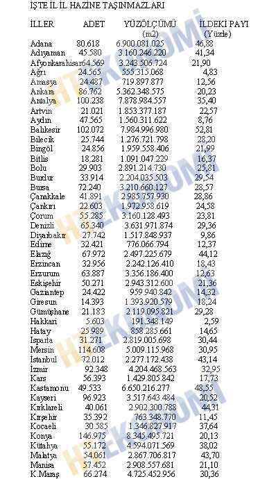 Milli Emlak Genel Müdürlüğü Faaliyet Raporuna göre, Hazineye ait taşınmazların iller itibariyle sayıları, kapladığı alan ve il yüzölçümü içindeki payları şöyle: