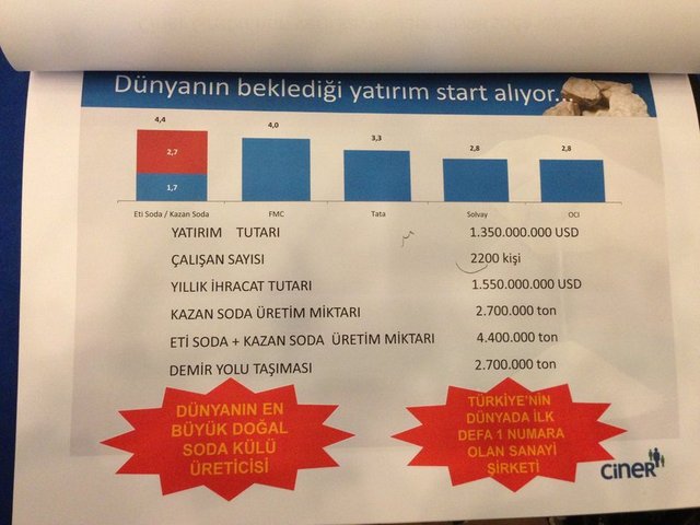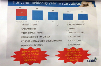 Ciner, ''Yatırım nasıl finanse edilecek, trona rezervinin Türkiye'deki durumu ne ve 1,7 milyar dolarlık ihracatın ne kadarı soda külünden gelecek?'' sorusuna şöyle cevap verdi: ''2016-2017'de tamamlanacak ve 5 bölümden oluşan elektrik bir yapıdır. Yapacağımız 1 milyar 750 milyon dolarlık ihracatın, yaklaşık 1 milyar 250 ile 1 milyar 300 milyon doları sodadan oluşacaktır. Bunun içinde Eti Soda da olacaktır. Bu yatırımın finansmanı Çin bankalarından yapılacaktır. Yerli banka kullanmayacağız. 2 bin 200 kişi çalışacak. Günlük 8 bin ton mal taşınacak. Ulaştırma Bakanlığı ve Devlet Demir Yolları ile anlaşmamızı yaptık. Bu yatırımı da Devlet Demir Yolları adına mali kısmını biz yükleniyoruz. Günde yaklaşık 4 tren ile mal deniz kıyısına taşınacak. Malın tamamı Güney Amerika, Avustralya dahil olmak üzere ihraç edilecektir. Mal satışında herhangi bir zoruluğumuz yoktur. 2013 üretimimiz bugünden itibaren satılmıştır. 1 milyar 100 milyon ton trona rezervi mevcuttur. Bu bayağı yüksek bir rakamdır. Beypazarında 240 milyon civarında üretimiz vardır. Büyük bir kaynaktır. Hocam olarak gördüğüm Rahmetli Cumhurbaşkanımız Özal'ın Türkiye'nin borcunu ödeyecek dediği rezervi benim yapmam iyi bir öğrenci olduğumu da gösteriyor.''