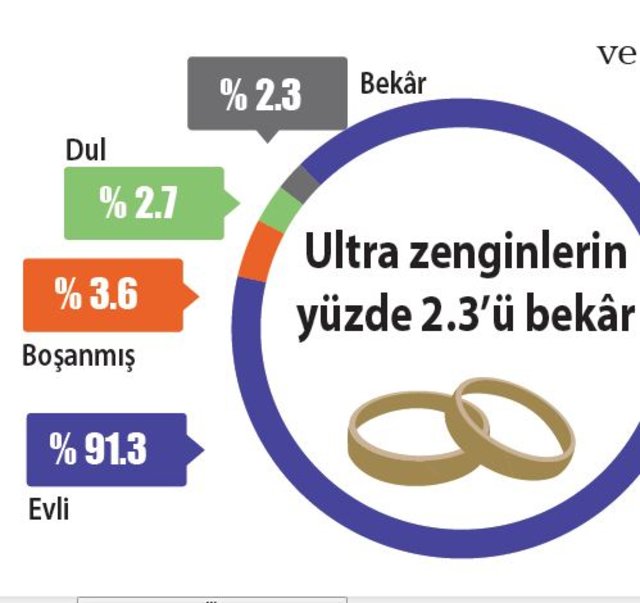 Medeni durumuna göre dağılıma bakıldığında, ortalama yaşın 59 olduğu ultra zenginlerin yüzde 2.3’ünün bekâr, (yaklaşık 5 bin kişi) yüzde 2.7’sinin dul ve yüzde 3.6’sının boşanmış olduğu ortaya çıktı.