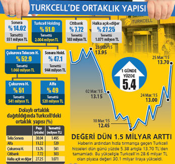 Peki genel kurulda oylanması durumda dağıtılacak olan 3.9 milyar liralık temettüden hangi ortak ne kadar para alacak? Bu rakamın 2 milyar lirası en büyük hissedar olan Turkcell Holding’e gidecek. Turkcell Holding’in genel kurulunda onaylanması durumunda da Turkcell Holding ortakları kâr paylarına kavuşacak. Şirkette yüzde 14.02 paya sahip Telia Sonera ise 551 milyon TL alacak. Turkcell’in halka açık kısmından yüzde 7.72 hissesini elinde bulunduran Citibank ise temettü olarak 303 milyon lira bekliyor. Yüzde 27.25 payı olan halka açık diğer ortaklar ise 1 milyar 71 milyon TL kâr payı alacak. Dolaylı ortaklıklar dağıtıldığında ise temettünün yüzde 38.04’ü yani 1 milyar 495 milyon lirası Sonera’nın kasasına gidecek. Yüzde 13.76 paya sahip Çukurova Holding ise 541 milyon lira bekliyor. Alfa Grup’un temettü geliri 520 milyon lira olurken, Citibank ve halka açık diğer hissedarlara dağıtılacak kâr payı değişmiyor.