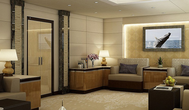 3 katlı uçak, geniş bir yemek odası, büyük bir mutfak, bir salon, bir kabul odası ve 8 yatak odasına sahip.