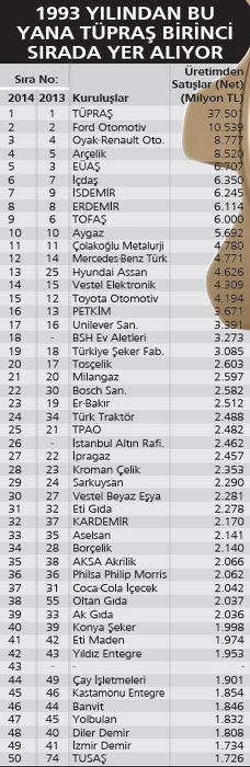 İstanbul Sanayi Odası, 2014 sonuçlarına dayalı Türkiye’nin en büyük 500 sanayi kuruluşu araştırması İSO 500’ü açıkladı. Birinci, 1993’ten bu yana olduğu üzere 37.5 milyar liralık üretimden satışlarla TÜPRAŞ oldu. İlk 10’da geçen yıla göre bir değişim yaşanmadı. Sadece EÜAŞ, üçüncülükten beşinciliğe, TOFAŞ ise altıncı sıradan dokuzuncu sıraya geriledi.