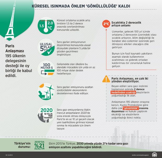 Paris'te 30 Kasım-11 Aralık tarihlerinde gerçekleştirilen konferansta, ülke delegelerinin oy birliğiyle kabul edilen anlaşma metninde, küresel ortalama sıcaklık artış limitinin 100 yıllık süreçte 1,5 ila 2 derece arasında sınırlandırılması konusunda uzlaşıldı. Anlaşmada, küresel ortalama sıcaklık artışının sınırlandırılması, fosil yakıtların aşamalı olarak azaltılması ve ciddi temiz enerji yatırımlarının hızlandırılmasını gündeme getirdi.