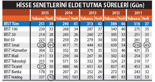 Hisse senetleri uzun vadeli yatırım aracı. Ama Türkiye’de öyle değil. Hatta para piyasasından bile kısa vadeli. Mevduatın ortalama vadesi 72 gün. Hisse senedinde ise yerlilerin vadesi 39 gün. Yerliler şimdiye kadar en yüksek yatırım vadesine 46 günle 2012’de ulaşmışlardı. Borsada yabancıların yatırım vadesi ise 251 gün oldu. Onlarda da son 4 yıldır bir kısalma söz konusu. 2012’de 389 güne çıkan vade üç yılda 251 güne indi ve hızlı bir düşüş gösterdi. Yerliler en uzun süreyle yatırımı holding ve sanayi şirketlerine yaparken, yabancılar ticaret sektörünü seviyor.