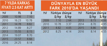 Dana etinin kilogram fiyatı ocak ayını 38.4 TL’den kapatarak tarihin en yüksek seviyesine ulaştı. Dana karkasın kilogram fiyatı da 24.43 TL seviyesine geldi. Bu fiyat seviyeleriyle Türkiye kırmızı eti dünya ortalamasından yüzde 80’e yakın pahalı yemiş oldu. Keza, dünyada et fiyatları 2016 yılına 4.55 dolarlık ortalamayla girerken, Türkiye’de bu rakam 8.14 dolar seviyesinde oldu. Üstelik aradaki bu fark TL’nin dolar karşısında değer kaybetmesi neticesinde azalmış olan bir oran. Bu oran 2010 yılında 3 kat farkı bile aşmıştı.