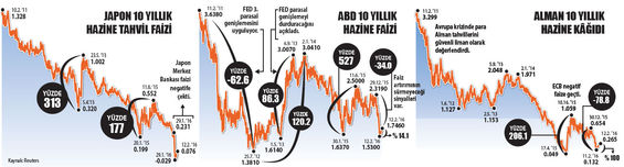-İsviçre, İsveç, Danimarka merkez bankalarının politika faizi, AB Merkez Bankası’nın mevduat faizi negatifti. Ocak sonunda Japonya Merkez Bankası da politika faizini eksiye çekerek bu kervana katıldı. Dünya ekonomisinde durgunluğu ve deflasyon korkusunu yenmek için merkez bankalarının negatif faiz uygulamaları yaygınlaşıyor. Negatif faiz daha kısa vadelerde daha yaygın. Dünyada 6 trilyon dolarlık bono ve tahvilin negatif faizle işlem gördüğü hesaplanıyor.