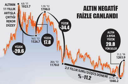 Faizlerin merkez bankalarının öncülüğünde negatif düzeye inmesi, FED’in artırımlarını bu yıl yapamayacağına dair beklentiler, para birimlerine karşı güvensizliğin artması, zaten geçmişten beri sığınılacak liman özelliği taşıyan altını yeniden parlatıyor. Geçen hafta 1.263.9 doları gören altının onsu son iki ayda yüzde 20.8 yükseldi. Altın 17 Aralık 2015’te 1046.2 dolara kadar inmişti. Böylece 2 ayda altının onsu 200 dolardan daha fazla arttı.