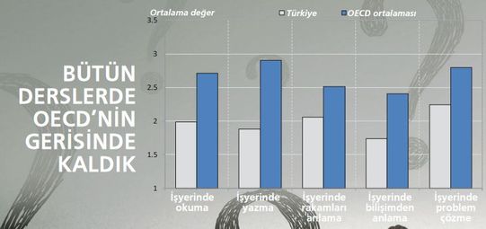 OECD’nin işyerinde yetişkinlerin becerilerini ölçen araştırmasına göre Türkiye, okuduğunu anlama, rakamları anlama ve problem çözmede sınıfta kaldı. 15 yaş grubundaki öğrencileri karşılaştıran PISA araştırmasında ortalamanın altında kalan Türkiye’de yetişkinler daha da kötü bir performans gösterdi. 40 ülkede 5’er biner yetişkinle yapılan görüşmeler neticesinde şekillenen PIAAC araştırmasına göre, okuryazarlık (işyerinde anlama-anlatım, anladığını uygulama), matematik ve teknoloji kullanım becerisi olmak üzere 3 alanda beceriler ölçüldü. Türkiye, işyerinde problem çözme ve teknolojiyi kullanmada 8 puanla OECD sonuncusu olurken, ortalama puan 31 çıktı. Çalışanların sadece yüzde 8’i bu alanda yetkin çıkarken, yetişkinlerin yüzde 40’ı işyerinde hiç bilgisayar deneyimi olmadığını söyledi. Bu oran OECD ülkeleri arasında en yüksek oran olarak dikkat çekerken, yetişkinlerin yüzde 45.7’si okuduğunu anlamada en kötü seviyede yer aldı. OECD ortalamasında bu oran yüzde 18.9 olurken, Türkiye sondan üçüncü sırada oldu. Rakamları anlamada (ki bu kategoride sayma, sıralama, basit aritmetik işlemler soruluyor) en kötü seviyede performans gösteren Türkler’in oranı da yüzde 50.2 oldu.