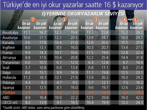 Bilgiyi işleme becerisi ile ücret ilişkisi Türkiye’de çok güçlü. Satın alma gücü paritesine göre düzenlenmiş saatlik ücretler baz alınarak yapılan sıralamada, Türkiye’de en iyi ücret alanlar arasında en yüksek okuryazarlık seviyesine sahip olanların aldığı saatlik ücret 16 dolar iken en iyi ücret alan en düşük okuryazarlık seviyesine sahip olanların aldığı saatlik ücret ise 6 dolar. Öte yandan, aynı okuryazarlık seviyesine sahip çalışanlar arasında dikkat çekici büyüklükte ücret farklılıkları var. Örneğin, okuryazarlık seviyesinde 5 kategoriden 2’nci kategoride yer alan bir çalışan okuryazarlık seviyesinde en yüksek kategoriye mensup bir kişiyle aynı ücreti (9 dolar) kazanabiliyor. Bu da, Türkiye’de çalışanların kazandığı ücretlerin başka unsurlar tarafından da belirlenebildiğini ortaya koyuyor.