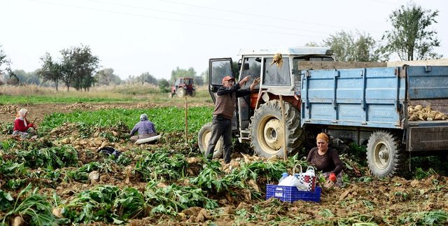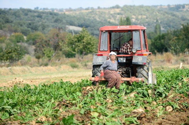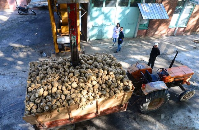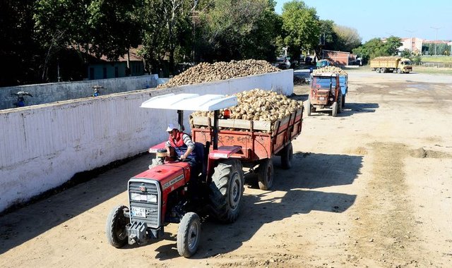 Toplanan pancarlar tarladan traktör römorklarına yüklenerek fabriya doğru yola çıkıyor.