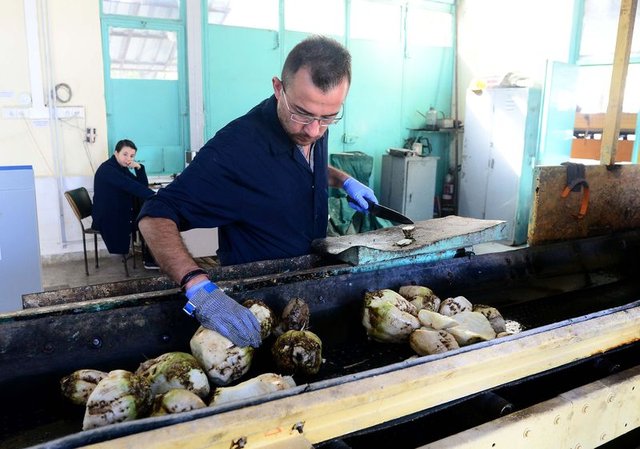 Temizlenen ve topraktan arındırılan şeker pancarları, pancar ayar çarkı makinesinde üzerindeki ot ve kök kalıntılarından temizleniyor.