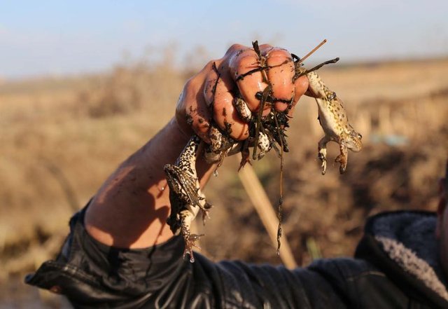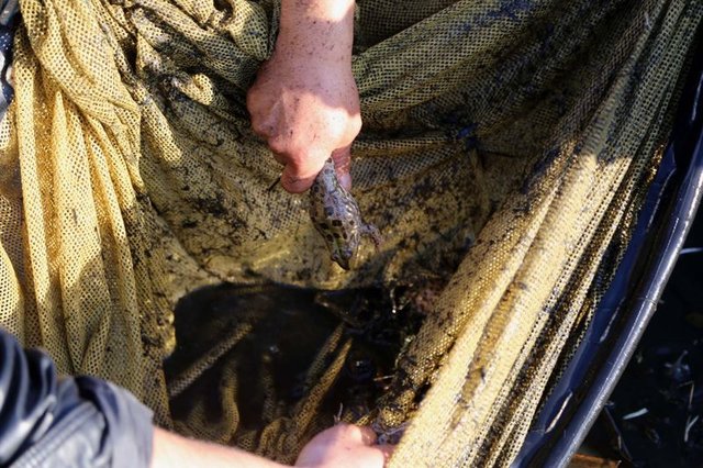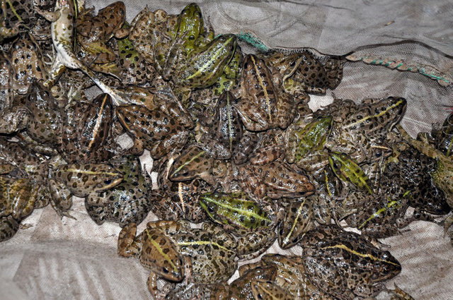 Sudaki akıntıdan sağa sola kaçan kurbağaların kepçenin içine girmesiyle, kurbağa avcılarının yüzündeki gülümseme daha da artıyor. Kepçeden alınan kurbağalar avcıların bellerine astıkları toplama çantalarında biriktiriliyor. Kepçedeki küçük kurbağalar ise yeniden suya salınıyor.