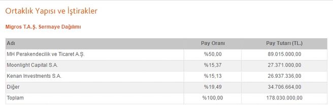 Perakende sektörü lideri Migros hisselerinin yüzde 50'si MH Perakendicilik'te bulunuyor. Mevcut durumda, MH Perakendecilik’in yüzde 19,5’u oranındaki Migros payları ise BC Partners tarafından yönetillen Moonlight Capital'e ait iken yüzde 80,5’i AEH’e ait.