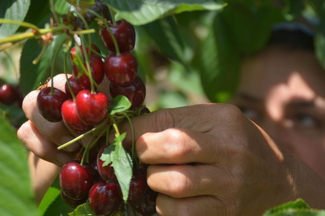 "Yılda bir ay bu işi yapıyoruz. Kendi kirazlarımız da var, bizimki erken bittiğinden buraya gelip çalışıyorum" diye konuştu.