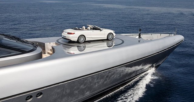 İşadamının özel isteklerine göre yeniden düzenlenen ve üretici firmayla aynı adı taşıyan lüks yat spor otomobil görünümü ve rengi ile görenlerin ilgisini çekti.