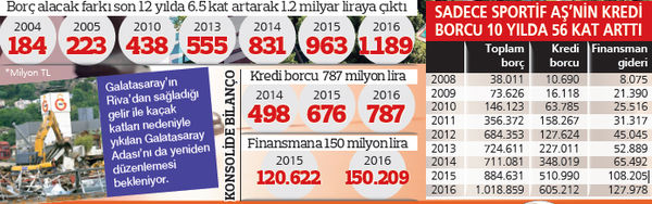 Kulübün net borcu sayılan borç alacak farkı 2005’te 223 milyon lirayken 11 yılda tam Riva’dan sağlanacak gelir kadar arttı ve 1.2 milyar liraya ulaştı. Kulübün yüzde 85’ini oluşturan Galatasaray Sportif AŞ bilançosundan derlediğimiz rakamlara göre de hem krediler hem kredi borcu hem de finansman gideri aslında son 10 yılda patlamış durumda. 2010’da Sportif AŞ Futbol AŞ birleşmesi için alınan krediyle 146 milyona çıkan borç 7 yılda yüzde 597 artarak şimdi 1 milyarı geçti. Sadece Sportif AŞ değil kulüp ve bağlı ortaklıkların borcu ise toplam 1 milyar 830 milyon lira düzeyinde bulunuyor. Borç-alacak farkı ise 1.2 milyar kadar. 2015’te rakam 963 milyondu. Yüksek faizli krediler ve artan kur ile birlikte sadece son 1 yılda net borç sayılan borç-alacak farkı 226 milyon arttı.