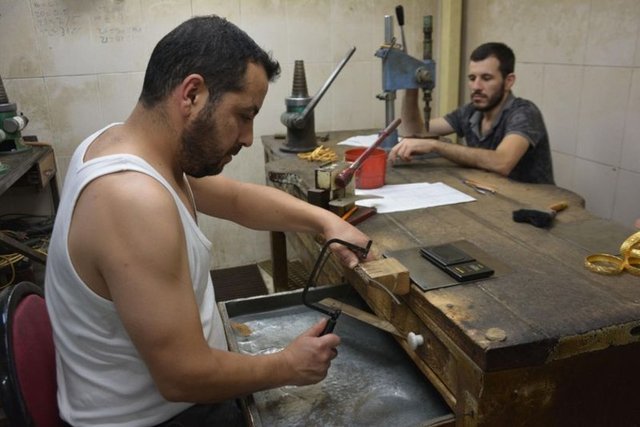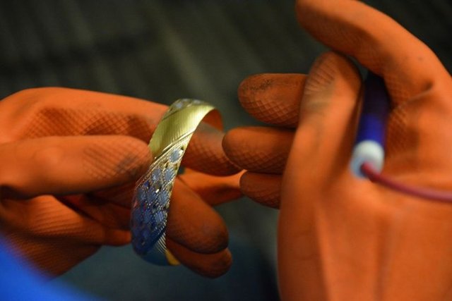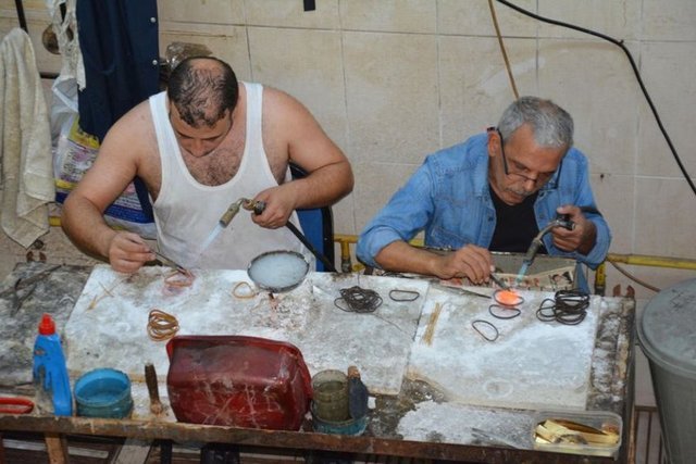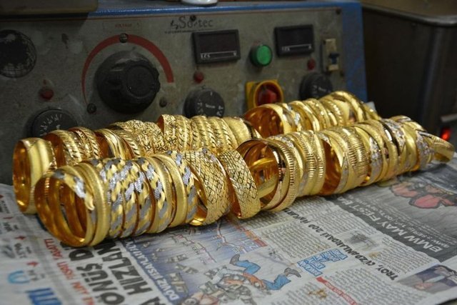 "Dışarıda toplanan hurda bilezik ve külçe altınları tel bilezik haline çevirerek kuyumculara veriyoruz. Altınları bin ile 1050 derecede eritip tezgahlarda genişlik ebatlarına göre şekillendirip, elle kesiyoruz. Ardından kaynak yapıyoruz. Büyütme makinesi dediğimiz makinelerde altınları geçirip modellerin özelliklerine göre gramlarını ayarlıyoruz ve genişliklerine göre kenarlarını kesiyoruz.
