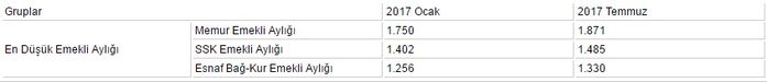 "Bu çerçevede aile yardımı ödeneği dahil en düşük memur maaşı 2 bin 558 liradan 2 bin 721 liraya yükselmiştir. 2017 yılı temmuz ayında memur emeklilerinin aylıklarında da enflasyon zammı dahil yüzde 6,92 artış yapılmış ve en düşük memur emekli aylığı bin 750 liradan bin 871 liraya yükselmiştir. Bu dönemde, SSK ve Bağ-Kur emekli aylıklarında ise yüzde 5,89 oranında artış sağlanmıştır. Böylece en düşük SSK emekli aylığı bin 402 liradan bin 485 liraya, en düşük esnaf Bağ Kur emekli aylığı ise bin 256 liradan bin 330 liraya yükselmiştir.