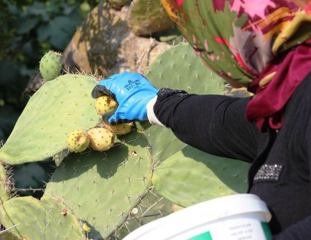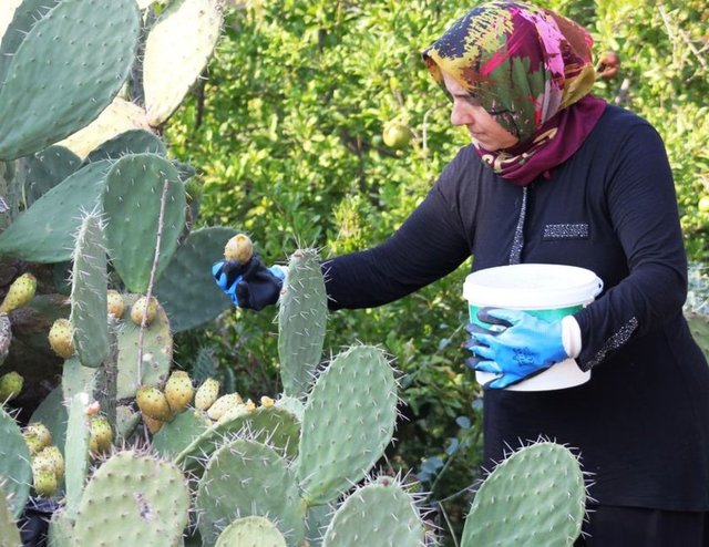 Yaz aylarında olgunlaşan kaktüslerden meyve veren, dikenli olması nedeniyle hasat sırasında özel dikkat gerektiren dikenli incir, genellikle sabah erken saatlerde toplanıyor.