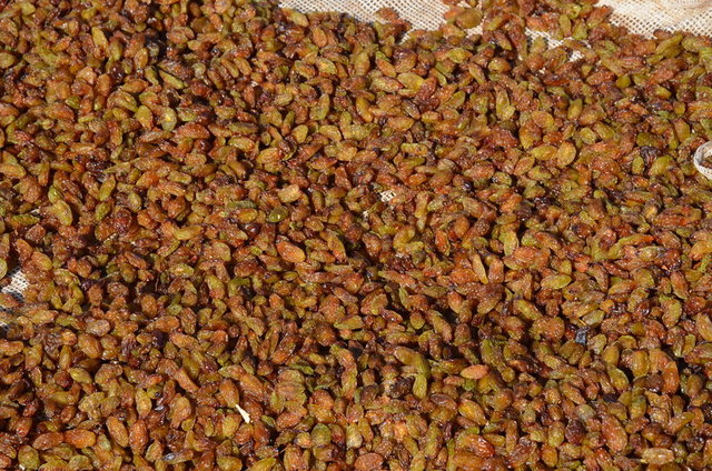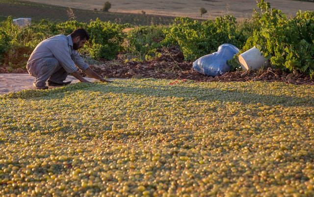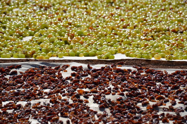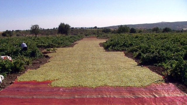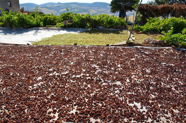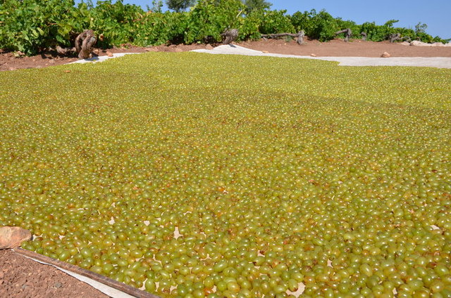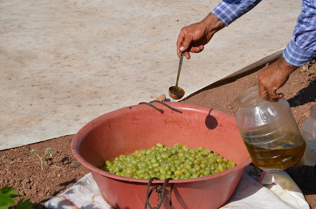 Sağlam olan üzümler, potasyum ve zeytinyağı karışımıyla yağlanarak daha önce hazırlanan sergi alanlarında güneş altında kurumaya bırakılıyor.