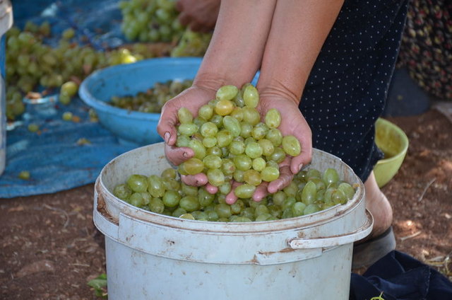 Bağ makasıyla teveklerden kesilen üzüm, tanelenerek hem salkımından hem de çürüğünden ayrılıyor.