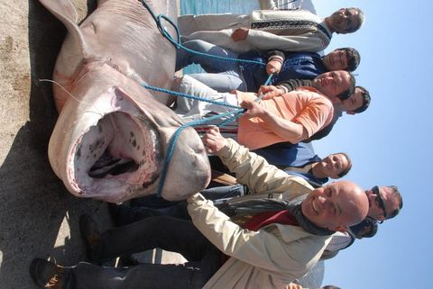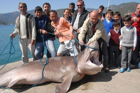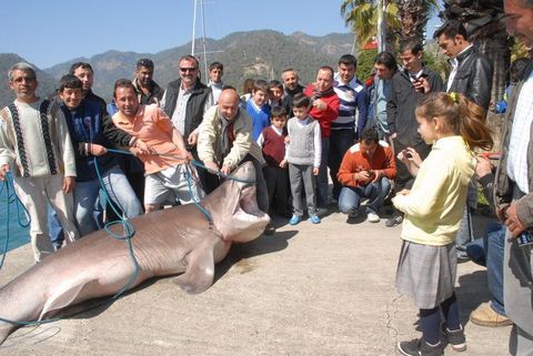 Muğla'nın Fethiye ilçesi Göcek beldesinde balıkçılar olta ile dev bir köpekbalığı yakaladı. 400 kilo ağırlığındaki 3.85 metre boyundaki camgöz cinsi köpekbalığı 1.5 saatlik uğraşın ardından tekneye bağlanıp iş makinesi yardımıyla kıyıya çıkarıldığında vatandaşlar büyük ilgi gösterdi.