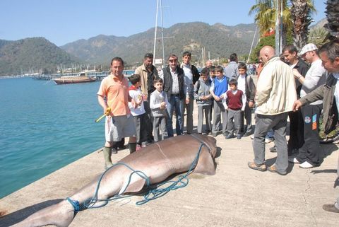 Yıllardır Göcek'te balıkçılık yapan kaptan Ali Akboyun, beraberinde balıkçılar Özay Güneş ve Yusuf Dikici ile mercan balığı avı için dün akşam saatlerinde Göcek açıklarına çıktı. Bir süre mercan avı yapan kaptan Ali Akboyun'un oltasına dev bir köpekbalığı takıldı. 1.5 saatlik uğraşın ardından balığı yakalayıp tekneye bağlayan Ali Kaptan ve arkadaşları, öğle saatlerinde Göcek Belediye İskelesi'ne getirdiler. 400 kilo ağırlığındaki ve 3,85 metre boyundaki camgöz cinsi köpekbalığı iskeleye getirildiğinde büyük ilgi ile karşılandı. İş makinesi ile denizden kıyıya çıkartılan dev köpekbalığını görenler gözlerine inanamadılar. Vatandaşlar cep telefonları ile köpekbalığını görüntülemeye çalışırlarken, köpekbalığını 8-10 kişi yerinden bile oynatamadı.