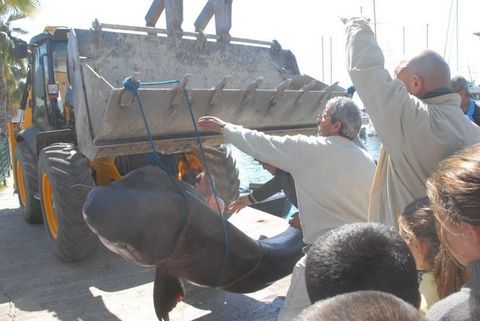 Tecrübeli balıkçı Ali Akboyun iş makinesi görevlilerinden yardım isteyerek, balığın depoya kadar taşınmasını istedi. İş makinesine halatla bağlanan dev köpekbalığı sahile yaklaşık 100 metre mesafedeki depoya götürülürken, çocuklar ve vatandaşlar bu anı yine cep telefonları ile görüntülemeye çalıştılar. Bazı vatandaşlar da, dev köpekbalığı ile hatıra fotoğrafı çektirdi. Mercan avına çıktıklarını belirten Ali Akboyun, "Oltalarımızı attık. Bir süre sonra bu balık takıldı. Yaklaşık 1,5 saat boyunca balığı etkisiz hale getirmek için uğraştık. Sonunda tekneye bağlayabildik. 400 kilo ağırlığındaki 3.85 metre boyundaki bu balığın genelde tehlikeli olmadığını biliyoruz. Ancak vücutta kan izi olursa ya da havyar dönemlerinde tehlike yaratabilir. Daha önce de benzer ama daha küçük köpekbalıkları yakalamıştık. İzmir'e göndermeyi düşünüyoruz" dedi. Balıkçılar Özay Güneş ile Yusuf Dikici de balığı yakalarken zorlandıklarını söyledi.