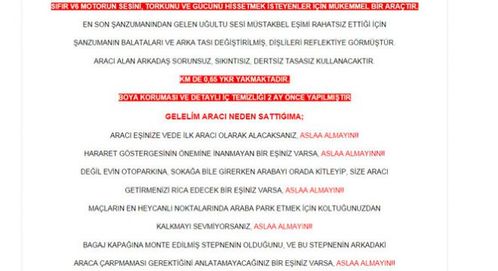 Bir internet sitesinde eşine aldığı arabayı satılığa çıkaran bir vatandaş, verdiği ilanla görenleri şaşkına çevirdi. Eşini eleştiri yağmuruna tutan şahsın verdiği ilan sosyal medyada çok beğenildi. Özellikle de vatandaşın aracı neden sattığını açıkladığı bölümdeki eleştiri yağmuru dikkat çekti.