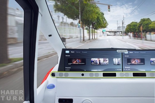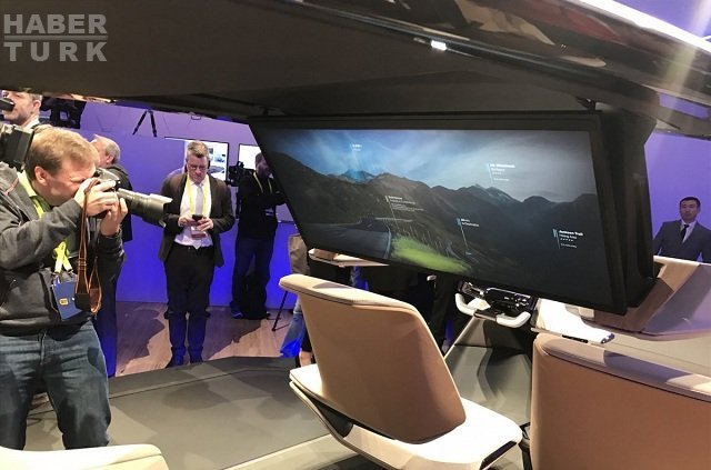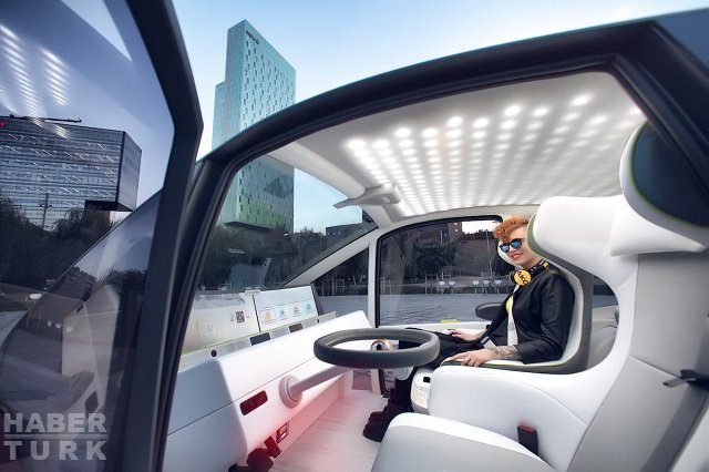Sürücüsüz modda kendi kendine ilerleyen araçta arka koltuğa oturanlar dev ekran sayesinde istediğini izleyebiliyor.