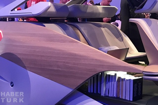 BMW konseptinde iç mekanlar ev detaylarıyla ayrışıyor. Ahşap malzeme kullanılmış ve bir kitaplık dahi var.