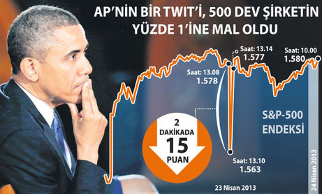 Uluslararası haber ajansı Associated Press'in (AP) ele geçirilen Twitter hesabından atılan sahte "Beyaz Saray’a saldırı" ve "Obama yaralı" twit'inin bedeli ağır oldu. Önceki gün ABD saati ile 13.08'de 1578 puan seviyesinde olan S&P 500 Endeksi, 13.10'da piyasalara bomba gibi düşen twit'in etkisiyle 2 dakikada 1563 puana geriledi. Toplam değeri 14 trilyon doları bulan S&P 500'deki şirketlerin toplam piyasa değeri, endeksteki 15 puanlık düşünün etkisi ile bir anda yüzde 1 eridi. Otomatik satış programlarının da yol açtığı ‘şok’ satışlarla, yatırımcılar 136 milyar dolarını borsadan çekti. AP’nin hesabının ele geçirildiğinin ve haberin ‘asılsız’ olduğunun açıklanması ile endeks, tekrar 1577 puana çıktı.