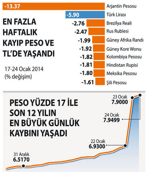 Arjantin’in para birimi peso 12 yıl içerisindeki en büyük günlük kaybını yaşadı. Pesonun perşembe güniçi kaybı yüzde 17’lere ulaşırken, günü yüzde 13 düşüşle tamamladı. Pesonun yılbaşından bu yana kaybı ise yüzde 21’e ulaştı. Kara borsa piyasada ise düşüşün daha da fazla olduğu belirtiliyor. Yaşanan bu gelişmeler Güney Amerika’nın en büyük ikinci ekonomisi için kur krizi tartışmalarını alevlendirdi.