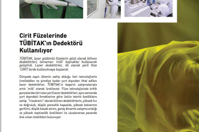 TÜBİTAK tarafından geliştirilen yeni nesil mayın tespit sistemi ETMTS-2, içerdiği iki algılayıcı yapısı sayesinde metalik ve plastik mayınları tespit edebiliyor. Sistemde bulunan LCD ekran, kullanıcının verileri görsel olarak takip etmesini sağlıyor. böylece operatör, tespit uyarılarını sadece işitmekle kalmayıp, görsel ikazları da takip ederek tespit başarımını artırabiliyor. Füze teknolojisinde bir ilke daha imza atan TÜBİTAK, lazer güdümlü füzelerin gözü olarak bilinen dedektörleri, tamamen milli kaynaklar kullanarak geliştirdi. Lazer dedektörler, ilk olarak yerli füze CİRİT'lerde kullanılmaya başlandı. TÜBİTAK'ın geliştirdiği yerli lazer dedektörler, füze teknolojisinde kritik parçalardan biri ve yurt dışındaki örneklerine göre üstün teknik özelliklere sahip. "4 Kadranlı" olarak bilinen dedektörler, yüksek hız ve doğruluk, düşük parazitik kapasite, yüksek belverme gerilimi, düşük kaçak akımı, geniş dinamik çalışma aralığı ve yüksek tepkisellik özellikleri ile uluslararası pazarda öne çıkan yeteneklere sahip.