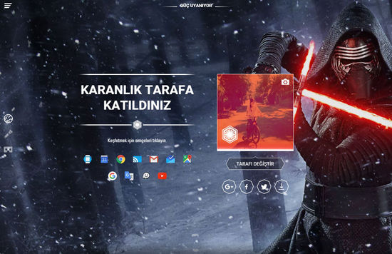 Star Wars için hazırlanan doodle kapsamında öncelikle 'tarafını seç'iyorsun. Mavi ya da kırmızı ışın kılıcını yani aydınlık ya da karanlık tarafı seçtikten sonra doodle çok daha eğlenceli hale geliyor.